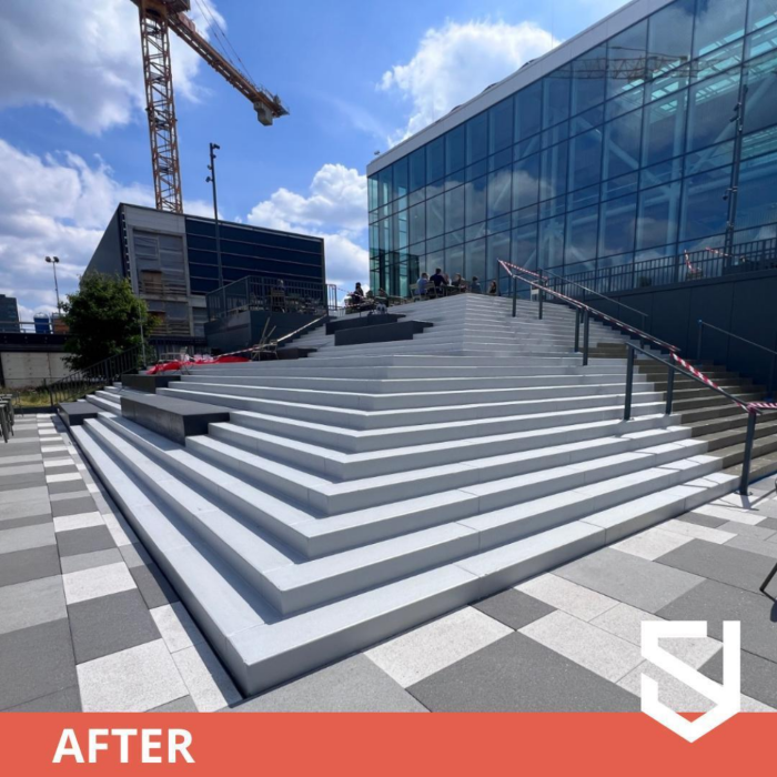 Om deze problemen op te lossen, hebben we de betonschades zorgvuldig hersteld en de trappen voorzien van het duurzame Triflex TSS systeem. Dit systeem biedt niet alleen een langdurige bescherming van de betonconstructie, maar zorgt ook voor een uitstekende antislipwerking. Hierdoor is de veiligheid van de gebruikers aanzienlijk verbeterd.